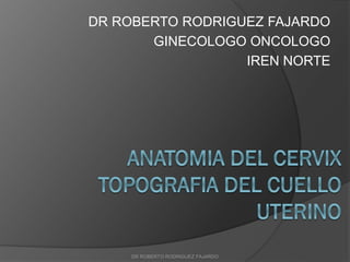 El documento describe la anatomía del cuello uterino. Explica que el cuello uterino es un segmento cilíndrico y estrecho del útero que se observa a través de la vagina y mide entre 2 a 4 cm. Describe la anatomía del cuello uterino incluyendo los tipos de epitelio que lo componen, como el escamoso, columnar y metaplásico. También explica las características de la zona de transformación donde ocurre el cambio del epitelio columnar al escamoso.