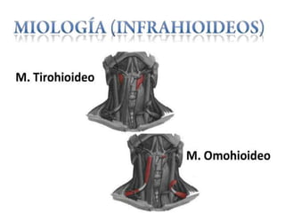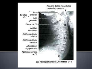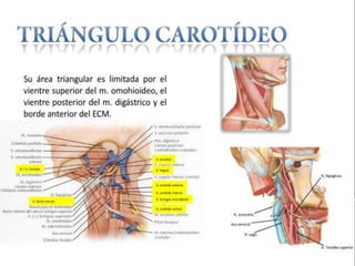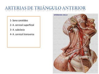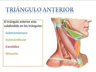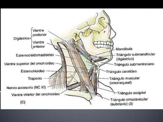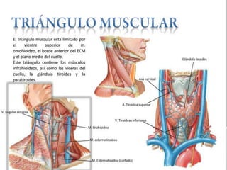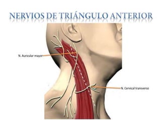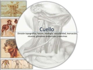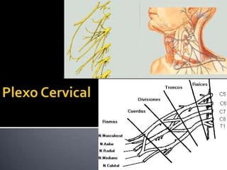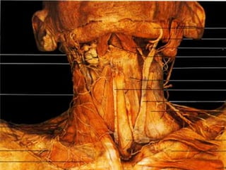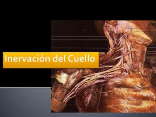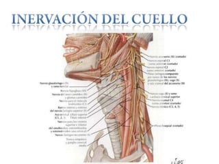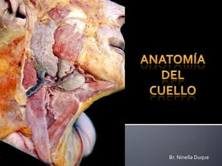 Este documento describe la anatomía del cuello. Resume las estructuras óseas, fasciales y nerviosas principales del cuello. Menciona las 7 vértebras cervicales típicas y 3 atípicas, y los huesos hioides y clavículas. Describe las fascias cervicales superficial y profunda, y las 4 regiones del cuello. Finalmente, enumera los principales nervios cervicales y sus ramos.
