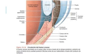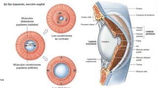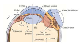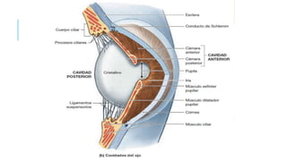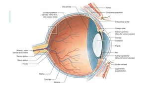 El documento proporciona una descripción general de la anatomía del globo ocular. El ojo está compuesto de tres túnicas concéntricas: la túnica fibrosa externa (esclerótica y córnea), la túnica vascular intermedia (iris, cuerpo ciliar y coroides) y la túnica nerviosa interna (retina). La retina contiene fotorreceptores, células nerviosas y vasos sanguíneos. Los axones de las células ganglionares de la retina forman el nervio óptico que transmite la inform