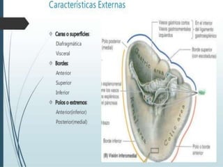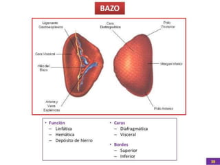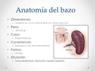 El bazo es un órgano situado en el cuadrante superior izquierdo de la cavidad abdominal que desempeña funciones inmunitarias y hemáticas como la destrucción de glóbulos rojos viejos y la producción de nuevos. Mide aproximadamente 13 cm de largo, 8.5 cm de ancho y 3.5 cm de grosor y pesa entre 125-175 gramos. Las enfermedades del bazo incluyen la esplenomegalia, que es el aumento anormal de tamaño del órgano y puede deberse a infecciones
