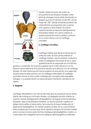 La laringe es una estructura móvil que forma parte de la vía aérea y actúa como una válvula que impide el paso de alimentos y cuerpos extraños hacia el tracto respiratorio inferior. Está compuesta por cartílagos y músculos que permiten la producción de la voz y variar el tono de los sonidos mediante el movimiento de las cuerdas vocales. Sus principales funciones son proteger las vías respiratorias inferiores, permitir la respiración y producir la voz.