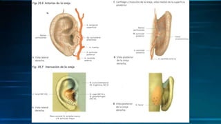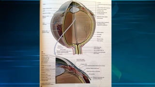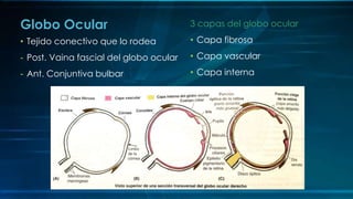 El documento describe la anatomía del ojo y el oído. El ojo contiene tres capas concéntricas: la capa fibrosa externa (esclera y córnea), la capa vascular media (coroides, cuerpo ciliar e iris) y la capa nerviosa interna (retina). El oído se divide en tres partes: el oído externo (oreja y conducto auditivo externo), el oído medio (membrana timpánica, huesecillos y músculos del oído medio) y el oído inter