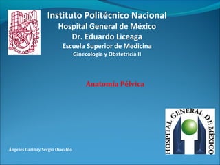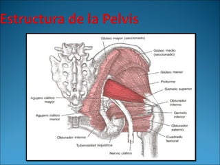 Este documento presenta una descripción anatómica detallada de la pelvis, incluyendo su situación, forma, límites óseos, contenido, articulaciones, ligamentos, agujeros, músculos, vasos sanguíneos, inervación y aspectos obstétricos relevantes. Se describe la anatomía de los huesos pélvicos, órganos reproductores internos y externos de la mujer, y las estructuras asociadas.