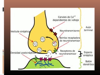 La neurona es la unidad estructural y funcional del sistema nervioso. Consta de un cuerpo celular o soma, dendritas que reciben información, y un axón que transmite impulsos nerviosos. La médula espinal conduce impulsos sensitivos al cerebro y motores del cerebro a los músculos, y también procesa información para realizar reflejos.