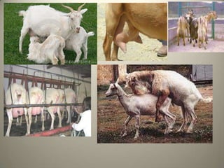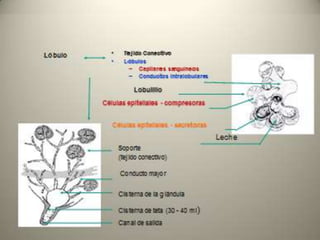 La glándula mamaria está compuesta de cuatro glándulas independientes con sus respectivos pezones. Cada glándula consta de parénquima glandular, sistema secretor, sistema excretorio e intersticial. El parénquima glandular contiene alvéolos rodeados de células musculares donde se secreta la leche. La leche pasa por conductos lácteos hasta la cisterna y el pezón. La forma y ubicación de la glándula varía entre especies como vaca, cabra y cerda.