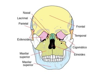 El documento describe la anatomía del sistema esquelético humano, enumerando los huesos que componen la cabeza, columna vertebral, tórax, extremidades superiores e inferiores. Se detallan los diferentes tipos y cantidades de huesos en cada una de estas secciones, como los huesos del cráneo, vertebras cervicales, torácicas y lumbares, costillas y huesos de las extremidades. También se incluyen los huesos del pie y la mano, detallando cada uno de sus componentes.