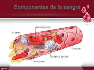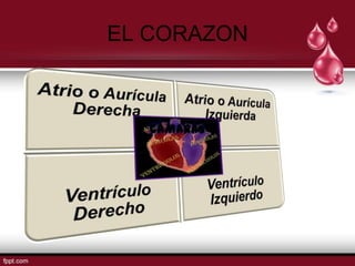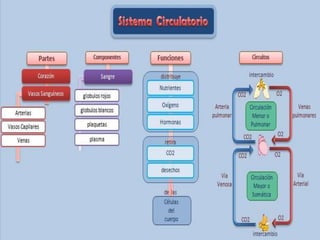El documento describe el sistema circulatorio y sus componentes principales. El corazón es el órgano central que bombea la sangre a través del cuerpo. Está dividido en cuatro cámaras y trabaja junto con los pulmones para llevar oxígeno a los tejidos. La sangre contiene glóbulos rojos, glóbulos blancos, plaquetas y plasma. Los grupos sanguíneos son importantes para las transfusiones de sangre.