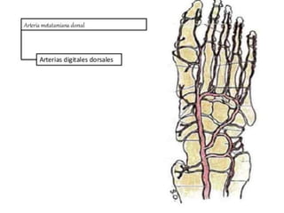 Este documento describe la anatomía de los arcos arteriales de la mano y el pie. Explica que la irrigación de la mano está dada por el arco palmar superficial, formado por las arterias radial y cubital, y el arco palmar profundo. También describe el arco dorsal de la mano y el drenaje venoso y linfático. En el pie, explica que el arco dorsal está formado por ramas de la arteria pedia y la arteria arcuata, mientras que el arco plantar recibe aporte de la arteria pedia perforante y la arter