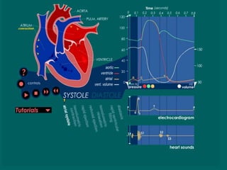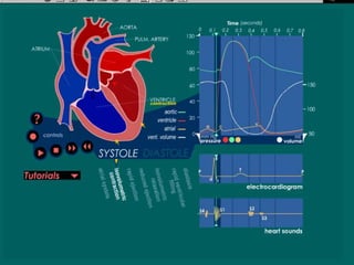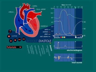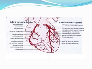 El documento describe la anatomía del corazón y el mediastino. El corazón se encuentra en el mediastino y está compuesto de dos bombas, una derecha y una izquierda, cada una con una aurícula y un ventrículo. El ciclo cardíaco involucra la contracción y relajación coordinada de las cámaras cardíacas impulsadas por el sistema de conducción eléctrico del corazón.