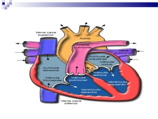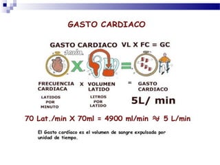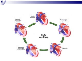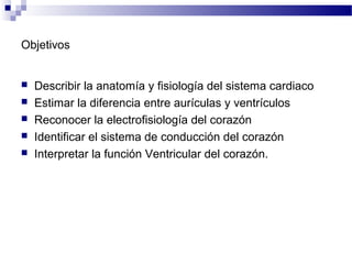 El documento describe la anatomía y fisiología del sistema cardiovascular. Explica las estructuras del corazón como las aurículas, ventrículos, válvulas y sistema de conducción. Describe la electrofisiología de las células cardiacas y el control neurológico del corazón. También define conceptos como precarga, poscarga, fracción de eyección y cómo se calculan parámetros hemodinámicos como gasto cardiaco e índice cardiaco.