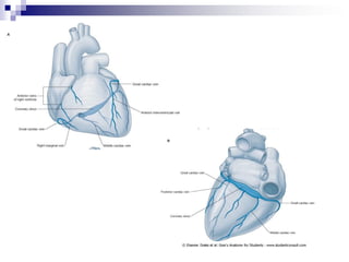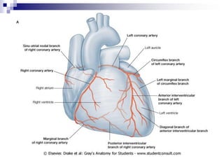 Este documento describe la anatomía del corazón humano, incluyendo su estructura, cavidades, vasos sanguíneos, válvulas y músculos. El corazón se localiza en el mediastino y mide aproximadamente 12 cm de largo. Contiene cuatro cavidades principales - las aurículas derecha e izquierda, y los ventrículos derecho e izquierdo - cada una con características específicas. El documento también describe la inervación simpática y parasimpática del corazón.