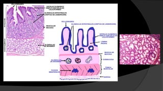 El documento resume la anatomía e histología del intestino delgado. Describe que el intestino delgado está compuesto por el duodeno, yeyuno e íleon. Explica que la mucosa intestinal aumenta su superficie a través de pliegues circulares, vellosidades y microvellosidades. También describe las diferentes capas del intestino delgado y los tipos celulares presentes en la mucosa, como las células de absorción, caliciformes y de Paneth.