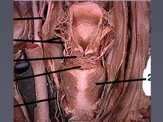 Este documento presenta una descripción anatómica detallada de la laringe. Describe las estructuras cartilaginosas que la componen (cartílagos tiroides, cricoides, epiglótico y aritenoides), sus articulaciones, ligamentos, membranas, vasos sanguíneos e irrigación. También explica los músculos intrínsecos y extrínsecos de la laringe y divide su anatomía en las zonas supraglótica, glótica y subglótica.