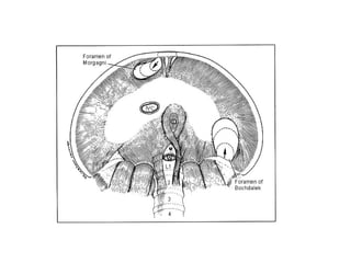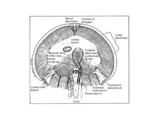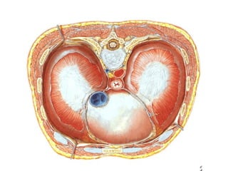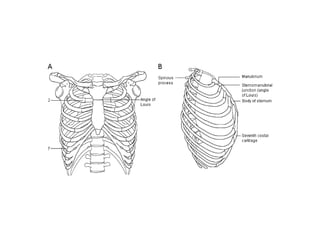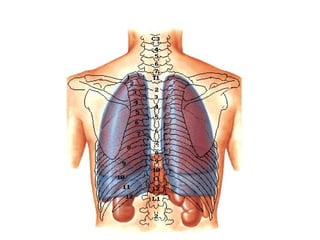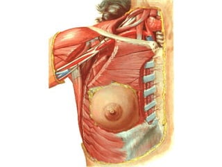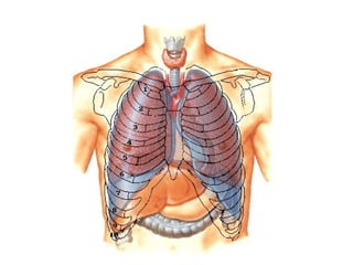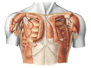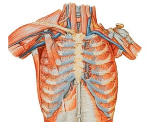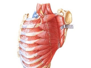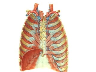 Este documento describe la anatomía de la pared torácica y los músculos del tórax. Explica la estructura ósea de la caja torácica, incluyendo el esternón y las costillas. También describe los principales músculos del tórax como el músculo pectoral mayor, serrato anterior, dorsal ancho e intercostales. Finalmente, explica la anatomía del diafragma y sus partes musculares y tendinosas.