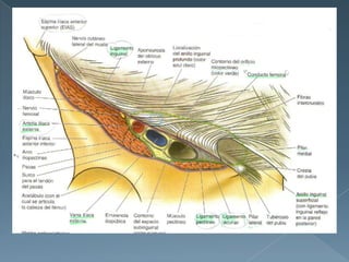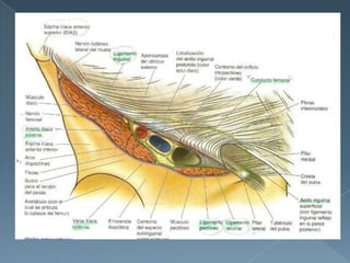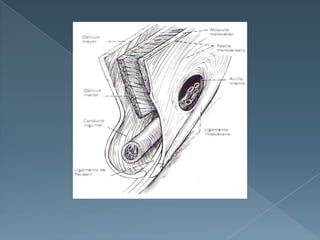 Este documento describe la anatomía del canal inguinal, incluyendo sus paredes, anillos, contenido y estructuras que lo atraviesan. También define las hernias inguinales, sus causas, diagnóstico a través de la inspección y palpación, y tratamientos quirúrgicos como la reparación de Lichtenstein que utiliza una malla protésica.