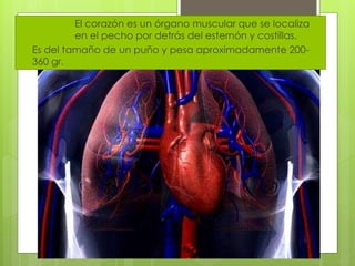 El corazón está dividido en cuatro cavidades: dos aurículas superiores y dos ventrículos inferiores. El corazón derecho recibe sangre de todo el cuerpo y la envía a los pulmones, mientras que el izquierdo recibe sangre oxigenada de los pulmones y bombea a la aorta para distribuirla por todo el cuerpo. El corazón contiene válvulas que regulan el flujo sanguíneo entre las cavidades y está compuesto de varias capas musculares y de tejido conectivo.