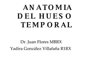 Este documento describe la anatomía del hueso temporal. Incluye información sobre las técnicas de imagen utilizadas para evaluarlo, su embriología y desarrollo, y una descripción detallada de sus estructuras anatómicas como el oído interno, medio y externo. Explica la cavidad timpánica, los huesecillos, el antro mastoideo, el conducto auditivo interno y sus componentes como el vestíbulo y el caracol. También describe las ventanas oval y redonda, el nervio facial y su