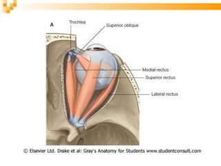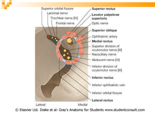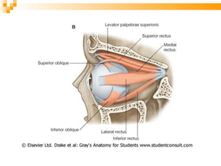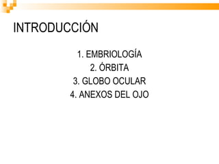 El documento resume la embriología, anatomía y estructura del ojo y sus anexos. Explica que el ojo se desarrolla a partir de las vesículas ópticas en el embrión, y describe las tres túnicas (externa, media y externa) que componen el globo ocular, así como sus contenidos como el cristalino y humor vítreo. También resume los músculos extrínsecos del ojo, párpados, conjuntiva, glándulas lagrimales y vasos sanguíneos asociados con la ó