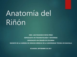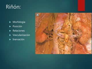 El riñón tiene una forma de haba y está situado en la fosa lumbar, con el derecho más bajo que el izquierdo. Internamente contiene la corteza renal y las pirámides renales, por donde desembocan los tubos colectores en las papilas renales. El riñón recibe irrigación de las arterias renales y drena la sangre a través de las venas renales, mientras que los nervios provienen del plexo celiaco y los troncos lumbares.