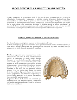Este documento describe la anatomía de los dientes, arcos dentales y estructuras de soporte. Explica que los dientes están compuestos de esmalte, dentina, pulpa y cemento. Los dientes forman arcos dentales en la maxila y mandíbula. Describe las características de la oclusión normal y las funciones de los dientes como la masticación, fonación y estética.