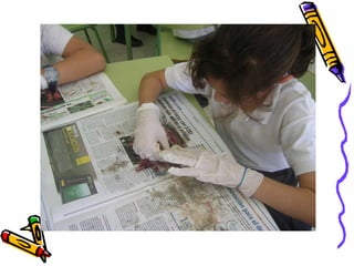 Los estudiantes de 5oA realizaron una práctica de laboratorio para aprender sobre la anatomía externa básica de una sardina y el uso de una lupa binocular. Se distribuyeron sardinas a grupos de 5 estudiantes por mesa, quienes usaron guantes y periódicos, y observaron escamas y branquias a través de la lupa. El profesor agradeció al Sr. Cerdán por su ayuda en preparar el aula para la práctica.