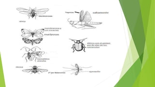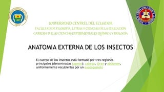 El documento describe la anatomía externa de los insectos. Se divide el cuerpo de los insectos en tres regiones principales: cabeza, tórax y abdomen. La cabeza contiene los ojos, antenas y piezas bucales. El tórax contiene las patas y alas. El abdomen tiene típicamente 11 segmentos. El exoesqueleto recubre todo el cuerpo de los insectos y está compuesto principalmente de quitina.