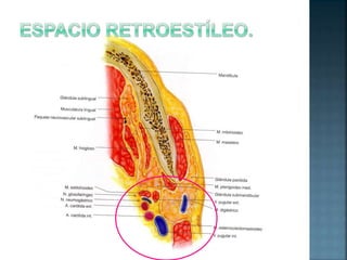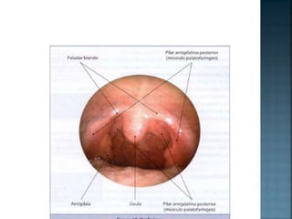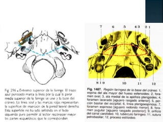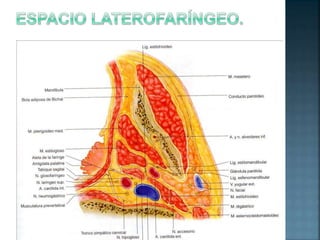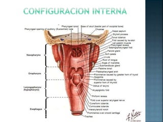El documento detalla la anatomía y funciones de la faringe, un conducto muscular que conecta las vías digestiva y respiratoria. Se describen sus dimensiones, límites, relaciones vasculonerviosas, así como la estructura de las paredes faríngeas y los músculos involucrados en su funcionamiento. También se aborda la importancia de la faringe en el drenaje venoso y la inervación, resaltando su rol en el sistema linfático y la acción de los músculos constrictores y elevadores.