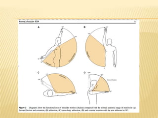Este documento presenta una lección sobre la anatomía funcional del hombro. Resume la osteología, artrología y músculos principales del hombro. Explica que el hombro está formado por la clavícula, escapula y húmero. La articulación glenohumeral es una diartrosis esférica que permite un amplio rango de movimiento. Los músculos deltoides, supraespinoso e infraespinoso son importantes para la movilidad y estabilidad del hombro.