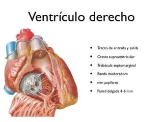 El documento resume las características anatómicas de los ventrículos derecho e izquierdo del corazón. El ventrículo derecho tiene forma de media luna, una válvula tricúspide, y está diseñado histológicamente para manejar volúmenes de baja presión. El ventrículo izquierdo tiene forma cónica aplanada, una válvula mitral, y está diseñado para manejar volúmenes contra alta presión.