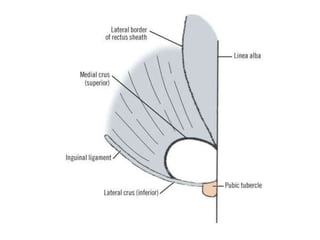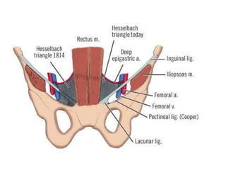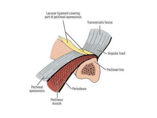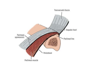 Este documento describe la anatomía de la región inguinal, incluyendo los músculos oblicuo externo e interno y transverso abdominal, y las estructuras asociadas como el ligamento inguinal, canal inguinal, anillos inguinales superficial e interno, y fascia transversalis. También describe el cordón espermático y sus componentes, así como otras estructuras como el ligamento de Cooper, área conjunta, y triángulo de Hesselbach.