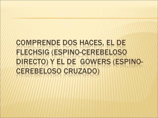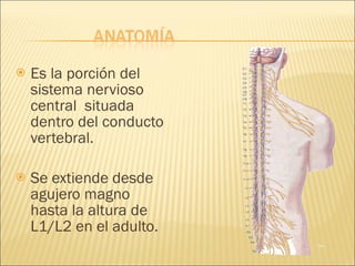 La médula espinal se extiende desde el agujero magno hasta la altura de L1/L2. Posee sustancia blanca que contiene tractos ascendentes, descendentes e intersegmentarios, y sustancia gris en forma de H que contiene grupos de neuronas. Cuando se lesiona, puede causar déficits motores y sensoriales dependiendo del nivel y extensión de la lesión.