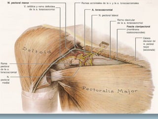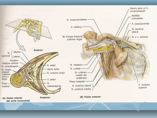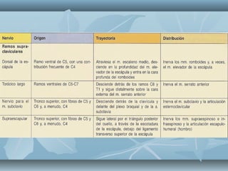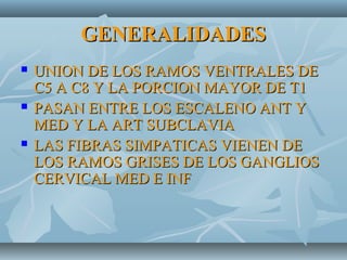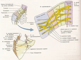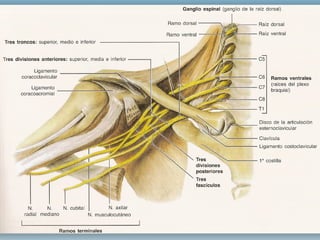 El plexo braquial se forma por la unión de los nervios cervicales C5 a C8 y la porción mayor de T1. Se divide en ramos supray ramos infraclaviculares que inervan diferentes músculos y regiones del brazo y la mano. Los principales nervios que emergen incluyen el dorsal de la escápula, torácico largo, subclavio, supraescapular, pectorales, musculocutáneo, mediano, cubital y radial.