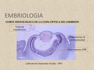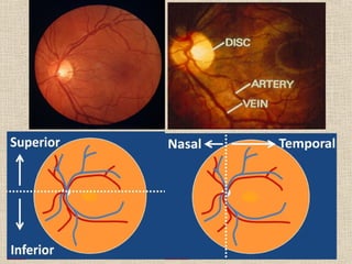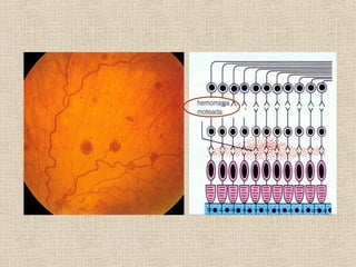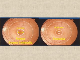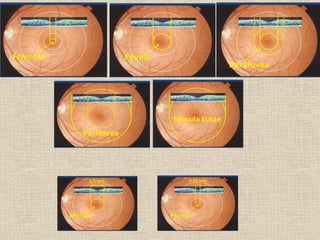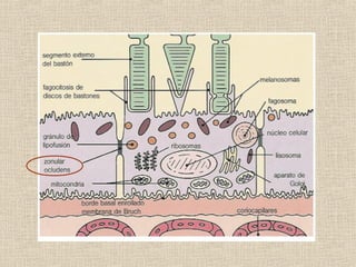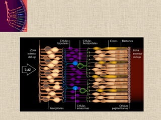 Este documento resume la anatomía macroscópica y microscópica de la retina. La retina está compuesta de 10 capas histológicas que incluyen la capa de fibras nerviosas, plexiformes interna y externa, y cuatro capas de células. La retina contiene fotorreceptores de bastones y conos, así como neuronas como células bipolares, horizontales y ganglionares. La irrigación de la retina proviene de la arteria ciliar posterior y la coroides a través de la barrera hemato-retiniana.