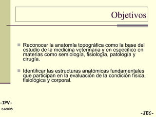 Este documento presenta información sobre la anatomía topográfica y las constantes fisiológicas en animales. Explica conceptos como planos anatómicos, direcciones anatómicas y sitios para medir constantes. También describe la dentadura del caballo y su relación con la edad, así como ejemplos de constantes fisiológicas como la frecuencia respiratoria, frecuencia cardíaca y temperatura. Finalmente, incluye actividades prácticas para reconocer la anatomía externa de diferentes animales y medir constantes f