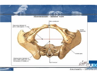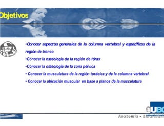 Este documento resume la anatomía de la columna vertebral y la región del tronco. Describe las diferentes regiones de la columna, sus curvaturas normales y patológicas, y sus articulaciones. También describe la osteología y musculatura de la región torácica, incluyendo las costillas y la cavidad torácica. Finalmente, resume la pelvis ósea, sus características, diámetros y diferencias entre la pelvis femenina y masculina, así como la musculatura y estructuras del periné y cavidad pélvica.