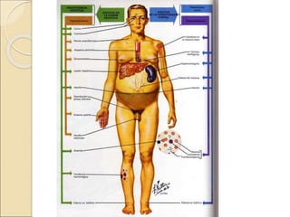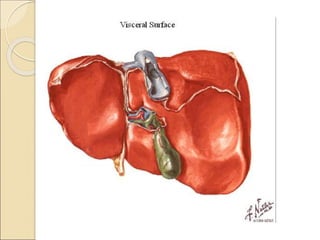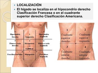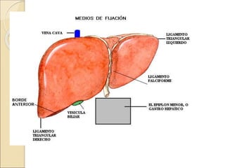 El documento proporciona información sobre la anatomía, fisiología y patologías más comunes del hígado, vía biliar y páncreas. Describe la localización, estructura y funciones del hígado, incluida su irrigación, composición histológica, metabolismo de carbohidratos, lípidos y proteínas, y formación de bilis. También explica brevemente la anatomía y funciones del páncreas y conducto pancreático. Por último, enumera algunas de las patologías más frecuentes que afect
