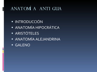 El documento detalla la evolución de la anatomía desde la antigüedad hasta el siglo XIX, destacando las contribuciones de figuras clave como Hipócrates, Aristóteles, Galeno y Vesalio. Se analiza la transición hacia una mentalidad anatomoclínica en el siglo XIX, donde la anatomía patológica empezó a concebir las enfermedades como resultado de las alteraciones anatómicas. Además, se menciona la influencia de la disección y el desarrollo de la medicina como una disciplina científica a lo largo de diferentes períodos históricos.