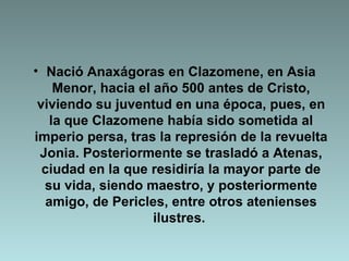 Anaxágoras fue un filósofo griego del siglo V a.C. que vivió la mayor parte de su vida en Atenas donde fue maestro de Pericles. Fue acusado de impiedad y desterrado de Atenas. Formuló una cosmología donde propuso que el orden del universo surgió a partir de la intervención del nous (inteligencia) sobre el caos original. Expuso doctrinas filosóficas donde admitió la existencia de un número infinito de elementos eternos e inmutables que se mezclan y separan, en lugar de los cuatro