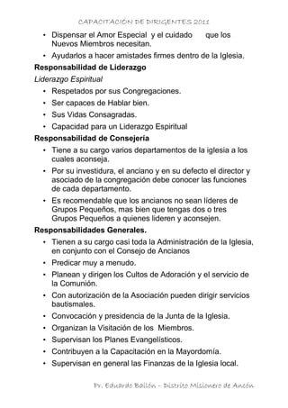 Este documento describe las responsabilidades y requisitos de los ancianos y directores de congregación. Los ancianos son llamados por Dios y elegidos por la congregación para proveer liderazgo espiritual y administrativo. Sus responsabilidades incluyen la alimentación de los miembros, supervisar las diferentes áreas de la iglesia, y servir como modelo espiritual a través de su dedicación diaria y vida ejemplar.