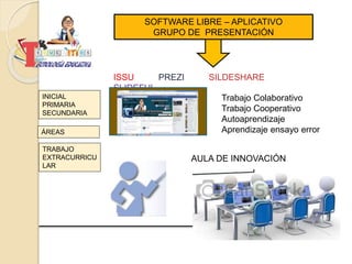 Este documento describe diferentes aplicaciones de software libre como Issu, Prezi, SlideShare y Slideful que pueden usarse como espacios virtuales de aprendizaje. Estas herramientas de presentación en grupo se pueden utilizar en áreas como la educación inicial, primaria, secundaria y el trabajo extracurricular para fomentar el aprendizaje colaborativo, cooperativo y por ensayo y error.