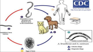 Ancylostoma spp son gusanos redondos intestinales que pertenecen al filo Nematoda. Incluyen especies como A. duodenale que infecta a humanos y A. caninum que infecta perros. Los gusanos adultos se adhieren al intestino delgado donde succionan sangre, causando anemia. Sus ciclos de vida incluyen etapas de huevos, larvas y adultos. Pueden causar anquilostomiasis u otras infecciones cutáneas en humanos. Se tratan con antihelmínticos