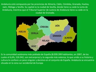 Andalucía está compuesta por 8 provincias en el sur de España, con Sevilla como capital. Es la región más poblada de España y cuenta con una rica historia y cultura. El documento describe brevemente las principales características y atracciones turísticas de cada provincia andaluza.