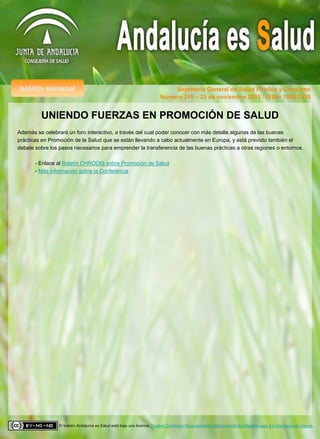 La conferencia "Uniendo fuerzas en Promoción de la Salud" se celebrará en Vilna, Lituania del 24 al 25 de noviembre para abordar la carga de las enfermedades crónicas en Europa. La conferencia está organizada por el grupo de trabajo "Buenas prácticas en el campo de la promoción de la salud y la prevención de las enfermedades crónicas a lo largo del ciclo vital" de la Joint Action CHRODIS. Andalucía participará como socio asociado y presidirá una sesión para exponer bu