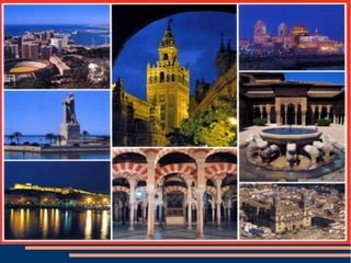 Este documento presenta información y fotografías sobre varias ciudades y regiones de Andalucía, incluyendo Granada, Almería, Jaén, Cádiz, Córdoba, Huelva, Sevilla y Málaga. Se destacan los principales monumentos, paisajes, festividades y gastronomía de cada lugar.