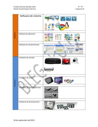 El documento clasifica diferentes tipos de software y hardware. Menciona que el software incluye software de sistema, de aplicación y de mantenimiento, mientras que el hardware incluye hardware de entrada, salida, almacenamiento y procesamiento.