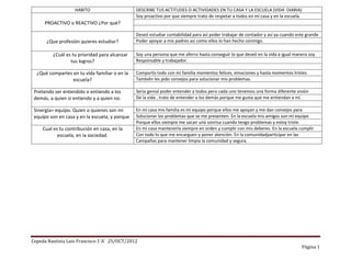 El estudiante se describe a sí mismo como proactivo porque siempre trata de respetar a todos en su casa y escuela. Planea estudiar contabilidad para poder apoyar a sus padres en el futuro. Se considera una persona responsable y trabajadora que se esfuerza por alcanzar sus objetivos. Comparte momentos felices y tristes con su familia, y les pide consejos. Trata de entender a los demás aunque reconoce que cada uno tiene su propia perspectiva. Considera que su familia y amigos son su equipo de apoyo, quienes lo ayud
