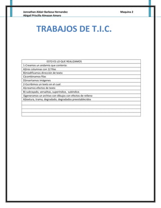El documento resume el trabajo realizado por Jonnathan Aldair Barbosa Hernandez Maquina 2 y Abigail Priscilla Almazan Amaro. Crearon un andamio con tres columnas y 12 filas, modificaron la dirección del texto y combinaron filas e insertaron imágenes. Escribieron un texto aplicando efectos como subrayado, versalitas, superíndice y subíndice. Finalmente, generaron un archivo con dibujos aplicando efectos de relleno como textura, trama y degradados.