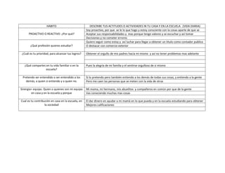 El estudiante describe su vida diaria como proactiva, aceptando responsabilidades y valores. Quiere estudiar contaduría pública o comercio exterior. Su prioridad es obtener el orgullo de sus padres y evitar problemas futuros. Comparte alegría con su familia y sentirse orgulloso de sí mismo. Trata de entender a los demás aunque no le gustan las personas que se meten en la vida de otros. Considera a su familia como su equipo por el apoyo mutuo y las cosas que aprende de ellos. Contribuye económicamente en casa y