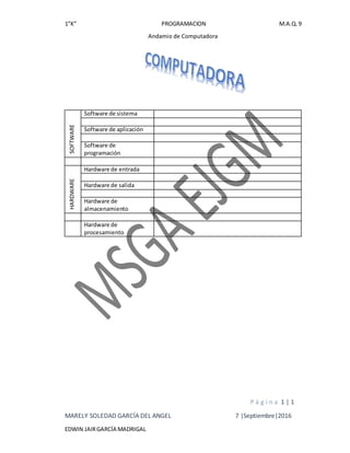 El documento clasifica los componentes básicos de una computadora en software y hardware. El software incluye el software del sistema operativo, aplicaciones y programación. El hardware incluye dispositivos de entrada y salida, almacenamiento y procesamiento.