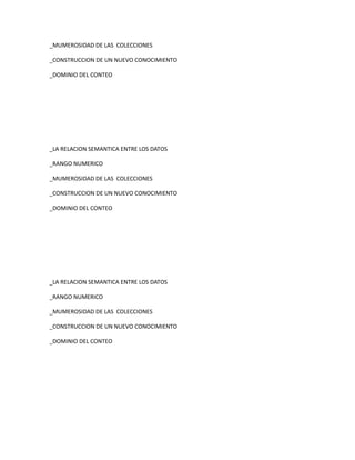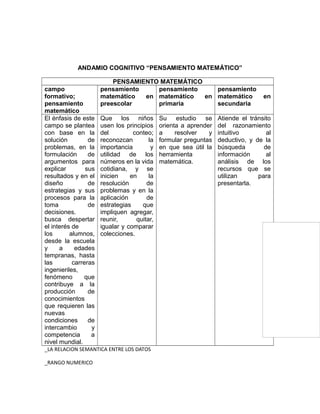 Este documento describe el campo del pensamiento matemático y cómo se desarrolla en diferentes niveles educativos. En preescolar, los niños usan principios de conteo y números en la vida cotidiana. En primaria, se enfoca en resolver problemas y aplicar estrategias de agregar, quitar y comparar. En secundaria, se orienta a resolver problemas usando herramientas matemáticas y razonamiento deductivo. El objetivo general es despertar interés en las matemáticas y carreras relacionadas desde temprana edad.